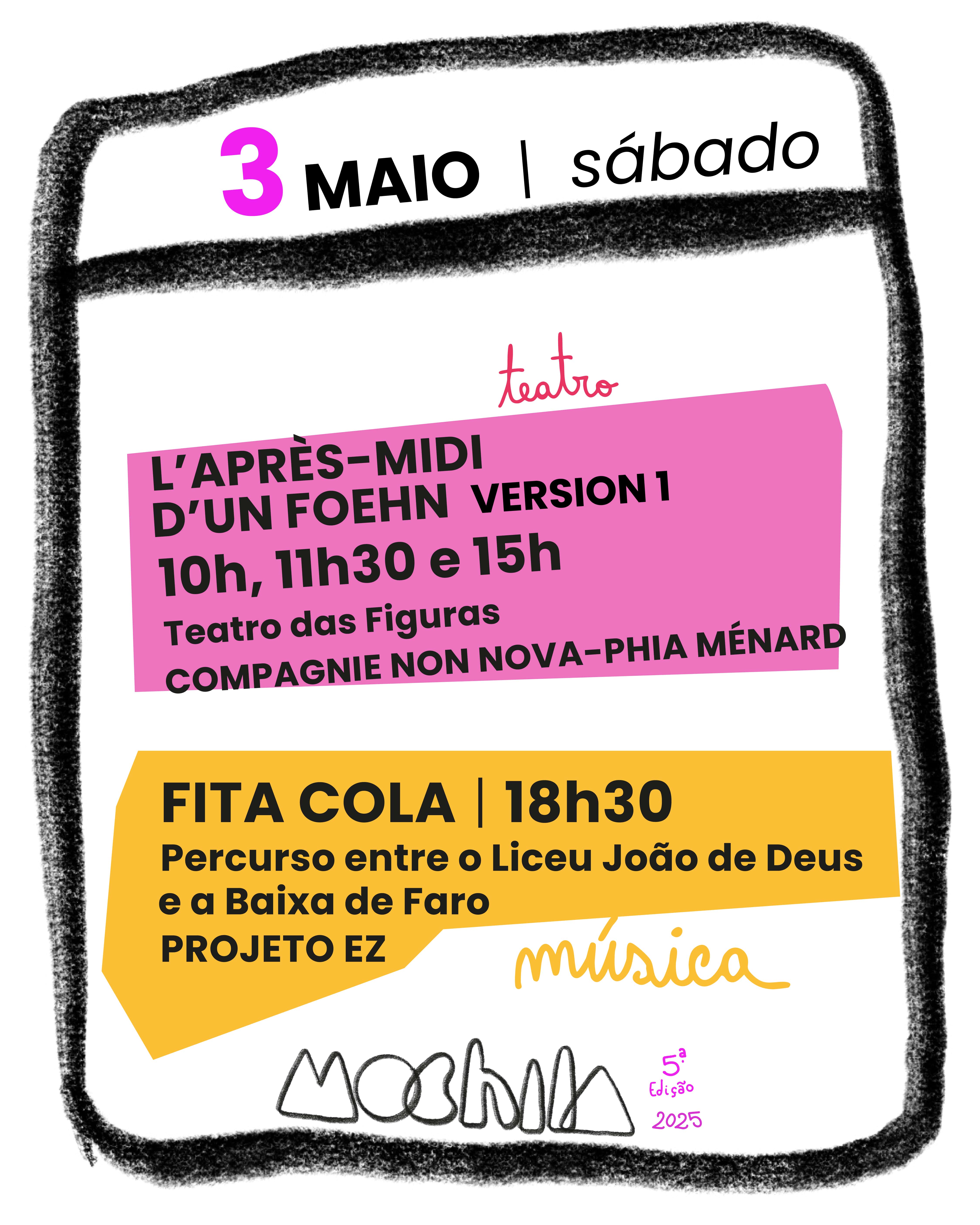 Cerca de 50 estudantes do curso profissional de Artes do Espectáculo da Escola Secundária Tomás Cabreia, invadem as ruas de Faro com pequenas performances coreográficas, recorrendo à exploração do programa da MOCHILA – Festival Internacional de Teatro para Crianças e Jovens. No final da performance, entregam-no a quem passa.